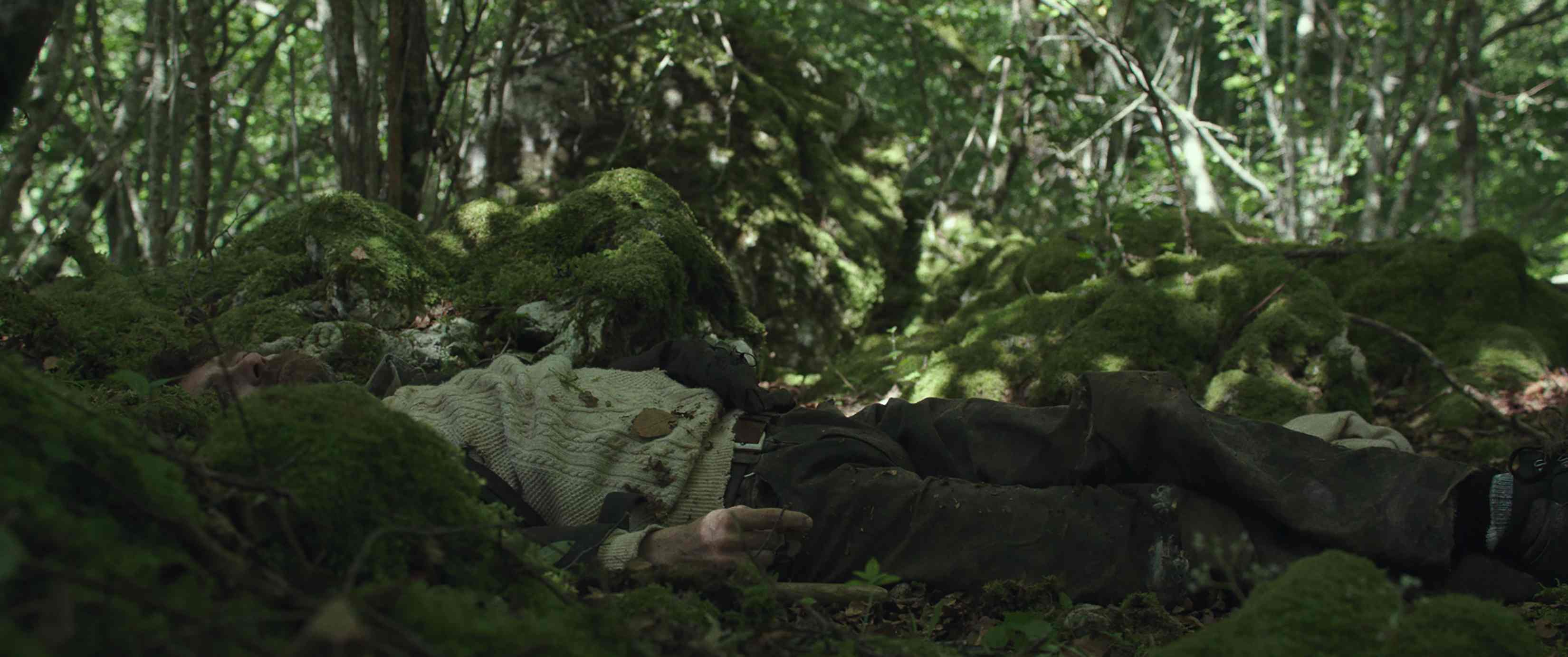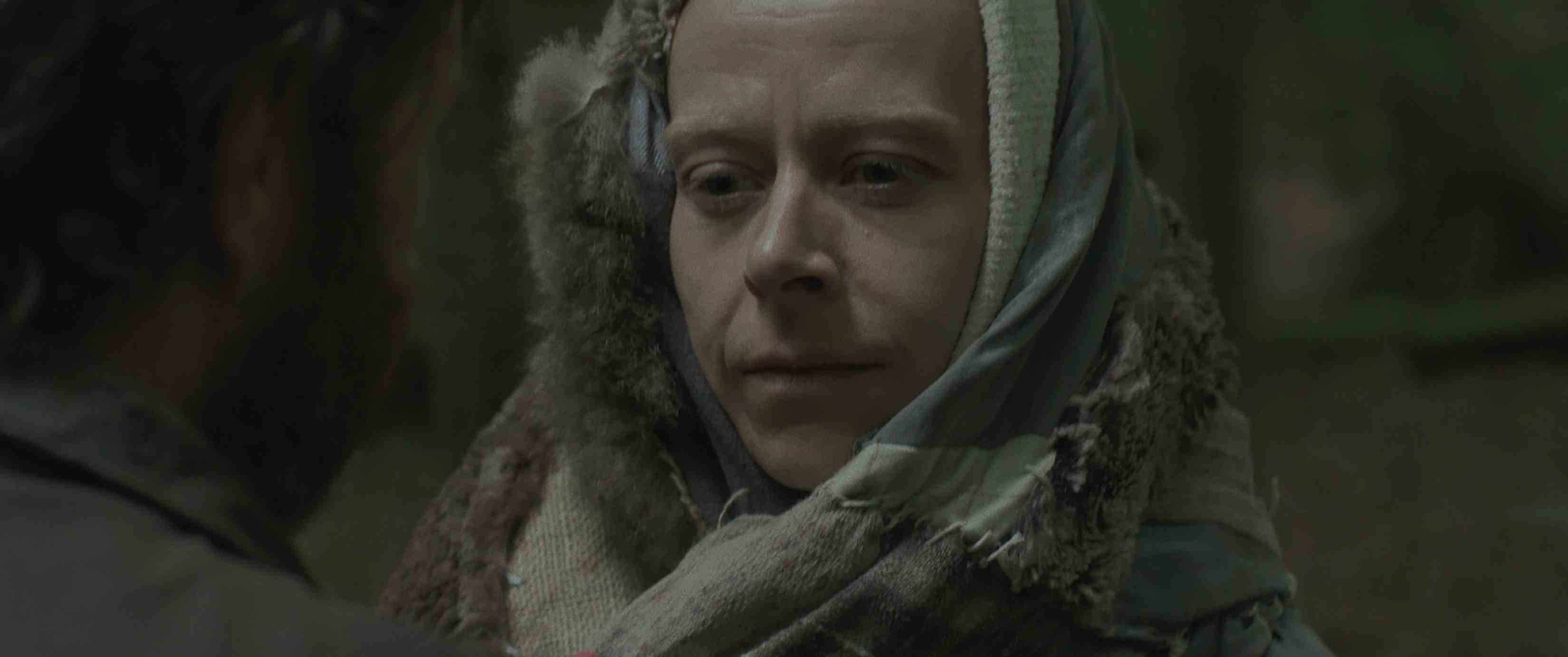 Couple in a Hole obscures the reasons behind Karen and John’s choice to dwell underground, until their routines are well established. They’ve developed roles for themselves as nurturer and hunter, where John has the responsibility of tracking, killing or gathering food for them. A collection of bugs or mushrooms is a delicious treat served on a leaf-plate. Karen however, suffers from agoraphobia, only attempting small progressions to the outside under John’s careful encouragement. This set-up is depicted by Geens as one the couple both take comfort in, and the director portrays their lush forest environment and the surrounding hills as something of a rural idyll. Sam Care’s cinematography captures the beauty of both the wide expanse of countryside and the safety of the forest enclosure.