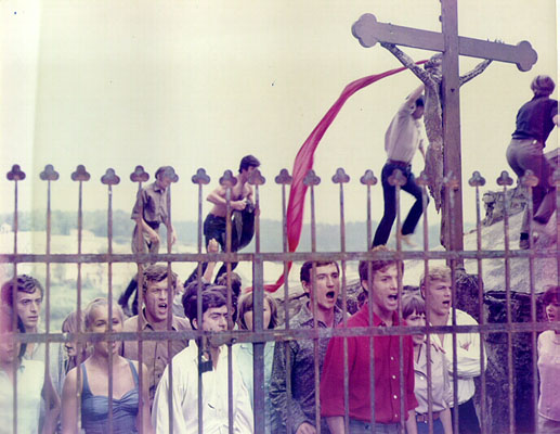 At the start we see a group of students stop military cars on the road in a pacifist demonstration, blocking their way and lying on the ground when provoked to move on. Gradually some of the soldiers join them in dancing, but their actions are watched at all times by the police officer, Kozma (András Kozak, of The Red and the White) who’s offering of advice or criticism seems to provide the audience perspective as the actions of the group escalate. Entering a monastery in order to challenge the pupils there regarding their ideas of democracy, free education and the use of power; the leader, Laci (Lajos Balázsovics) beco