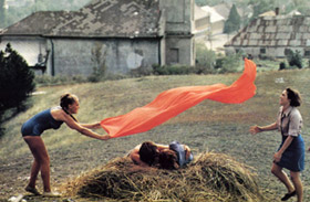Watching Miklós Jancsó’s The Confrontation (Fényes szelek, 1968) one can’t help but think of famous US melodramas about troubled youth and the struggle against hypocrisy such as Rebel Without a Cause or West Side Story. In his first foray into colour film, Jancsó proves himself as much a master of a striking palette – costuming his actors in symbolic red, for example – as he had demonstrated himself capable of building tension through a careful choreography of individuals such as in The Round Up or The Red and the White. Rather than the personal traumas of such US classics, with their focus on racial, familial or romantic power struggles, The Confrontation uses music and dance to muse upon and dissect the political ideology of students, in the wake of newly founded Communist rule in 1947 Hungary. Clearly reflecting the events of the time – student riots in Paris – Jancsó’s vitality as a director is perfectly attuned to balancing weighty, philosophical dialogue and the inner squabbles of the student group, with striking visual flair.
